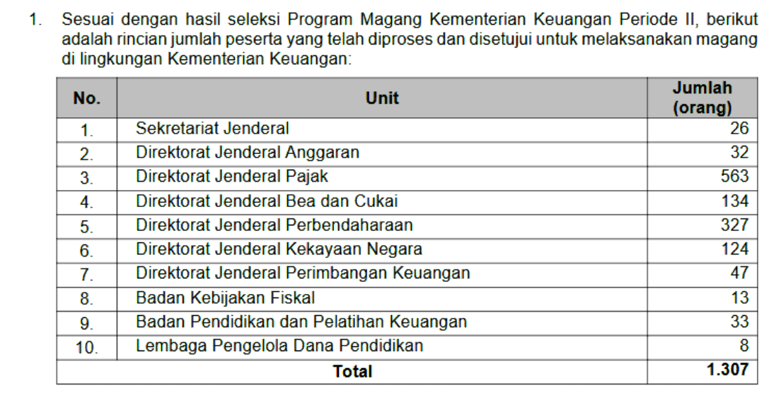 Program magang ini diselenggarakan oleh Kementerian Keuangan untuk membuka peluang belajar dan pengalaman kerja bagi mahasiswa di seluruh Indonesia. Pendaftaran telah dibuka pada 1–30 April 2025 melalui laman resmi https://magang.kemenkeu.go.id, dengan total 3.214 permohonan diterima dari berbagai perguruan tinggi. Setelah proses seleksi ketat oleh unit kerja tujuan magang, Muhammad Reyza Septian dinyatakan lolos dan berhak melaksanakan magang di lingkungan Kementerian Keuangan.
